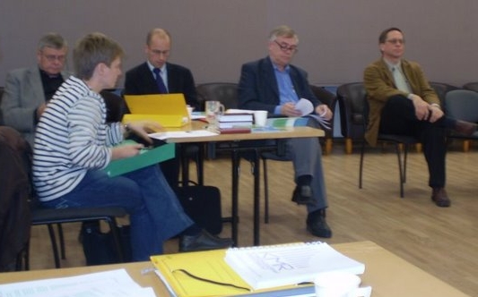 Vasemmalla Latvian luterilaisen kirkon edustaja Ilze Sprance ja hänen vieressään Ruotsin edustaja Lennart Ericsson Ruotsin kirkkomusiikkiliitosta. Oikeanpuoleisessa kuvassa Ulla Tuovisen (selin) keskustelutovereina ovat Norjan kirkon hymnologian ja liturgisen musiikin konsultantti David Scott Hamnes, Hugo Lepnurm -säätiön edustaja Kristel Aer Virosta ja Catharina Ericsson Ruotsista.